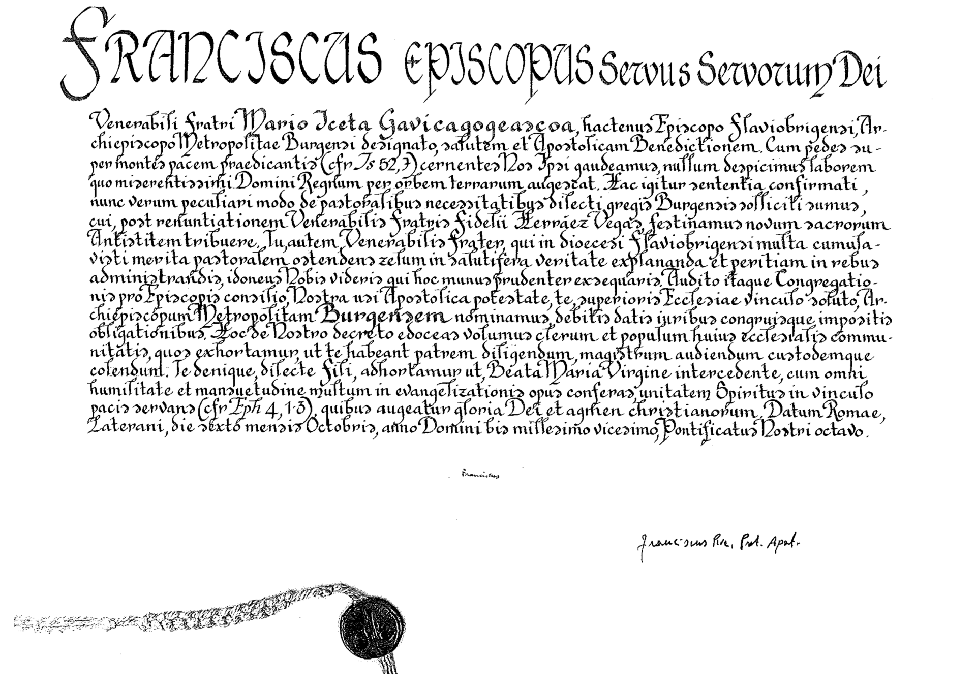 Detalle de la bula papal firmada el pasado 6 de octubre y con la que nombraba a Mario Iceta arzobispo de Burgos.