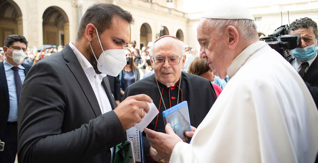 Pablo Moreno le entrega al papa Francisco la primera copia de su película ‘Claret’, en presencia del cardenal claretiano español Aquilino Bocos