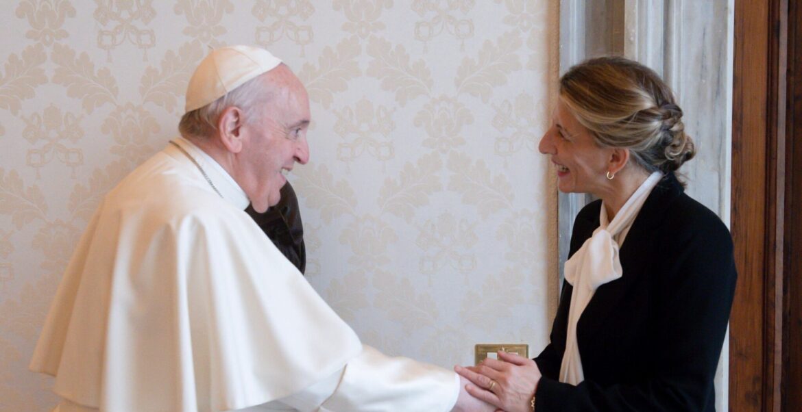 En concreto, Yolanda Díaz ha llegado a los palacios apostólicos con los decretos legislativos que ha emprendido España para paliar la crisis y el concepto de trabajo como agente social que da dignidad y aporta igualdad. Díaz no ha estado sola en la cita, sino que le ha acompañado el secretario de Estado de Empleo, Joaquín Pérez Rey.