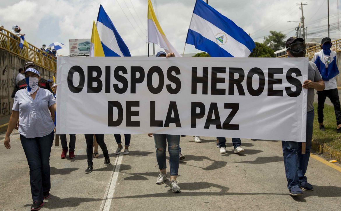 28/07/18.- Varias personas portan un cartel durante una marcha en apoyo a obispos, en Managua (Nicaragua). Foto: EFE/Jorge Torres