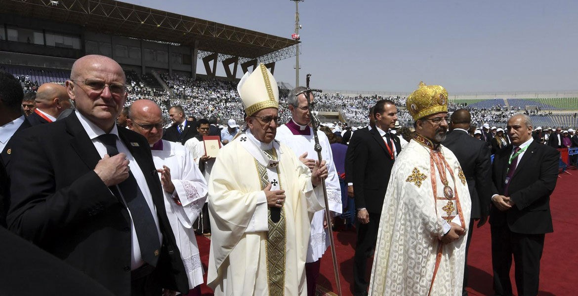 La celebración ha tenido lugar en un lleno Estadio Air Defense de El Cairo, animado por cánticos en árabe y el deseo de los participantes de compartir este momento con el Pontífice. Él, durante su homilía, les ha dejado un mensaje de coraje, de amor hacia “amigos y enemigos”, de confianza en el Dios que siempre asiste.