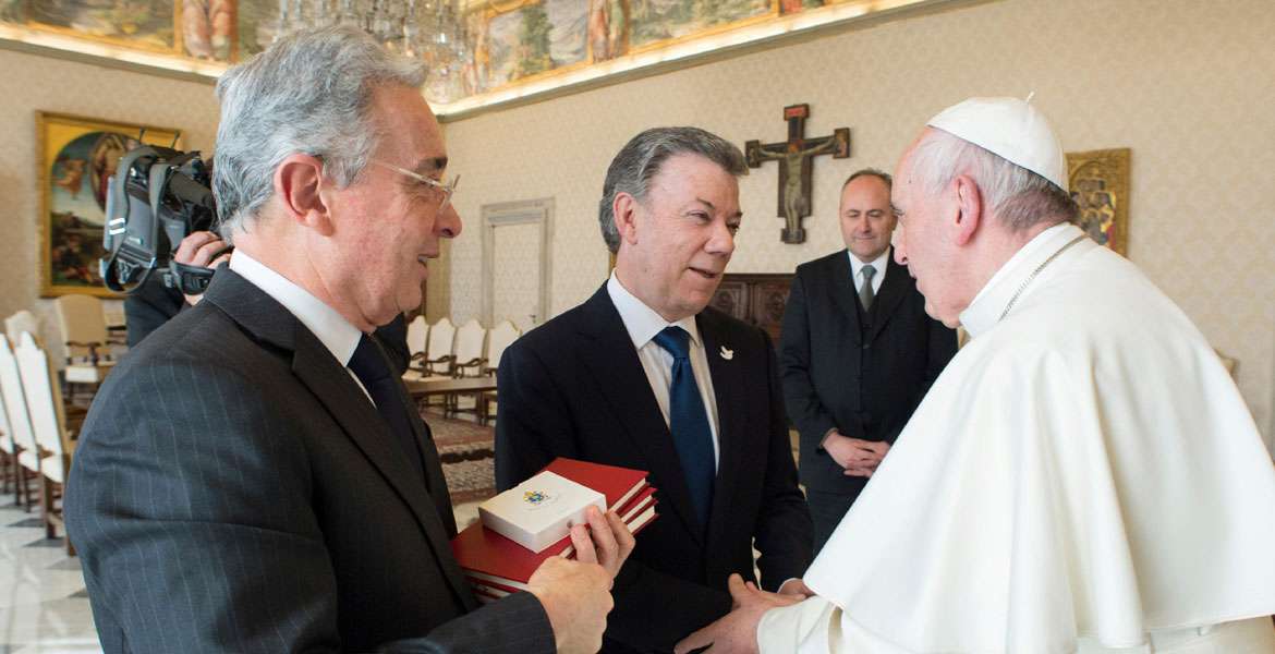 El Papa junto a Santos y Uribe en su histórica reunión en el Vaticano