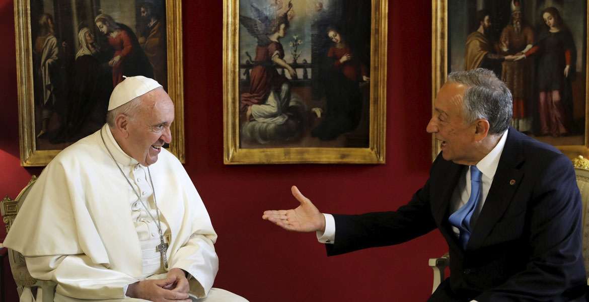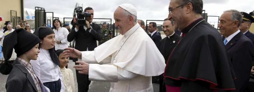 La bandera lusa y la del Vaticano sobresalían, como de costumbre cuando llega a un país, por la ventana de la cabina de los pilotos. Salieron los periodistas y cámaras del Centro Televisivo Vaticano y dos minutos después lo hacía el Pontífice. Sonriente bajaba las escaleras mientras le esperaba el presidente de la República Portuguesa, Marcelo Rebelo De Sousa.