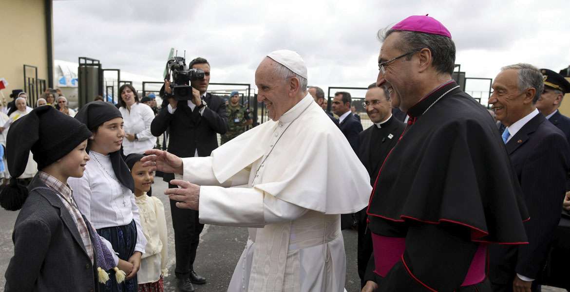La bandera lusa y la del Vaticano sobresalían, como de costumbre cuando llega a un país, por la ventana de la cabina de los pilotos. Salieron los periodistas y cámaras del Centro Televisivo Vaticano y dos minutos después lo hacía el Pontífice. Sonriente bajaba las escaleras mientras le esperaba el presidente de la República Portuguesa, Marcelo Rebelo De Sousa.