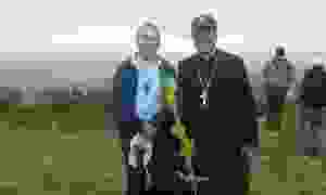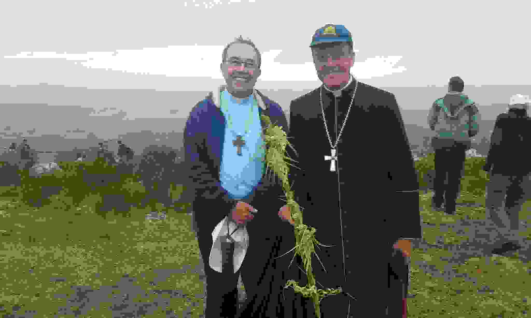 Heriberto Bodeant (obispo de Melo) y el local Jaime Fuentes en la cima del Cerro de la Virgen del Verdún / Ob. Minas