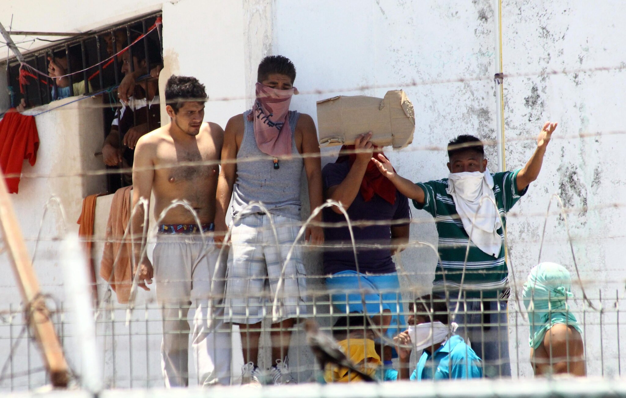 MEX45. CANCÚN (MÉXICO), 26/04/2015.- Internos se cubren durante un enfrentamiento hoy, domingo 26 de abril de 2015, durante un enfrentamiento en el penal de la ciudad de Cancún en el estado mexicano de Quintana Roo. La procuraduría estatal informó que abrió una averiguación por los delitos de motín, lesiones y lo que resulte luego del enfrentamiento que arrojó un saldo de 37 personas heridas leves y 11 más que fueron trasladadas al Hospital General. La dependencia indica que los hechos se suscitaron este domingo después de que se disputara un partido de fútbol entre internos donde surgieron diferencias entre ellos. EFE/Alonso Cupul ** Usable by HOY and FL-ELSENT Only **