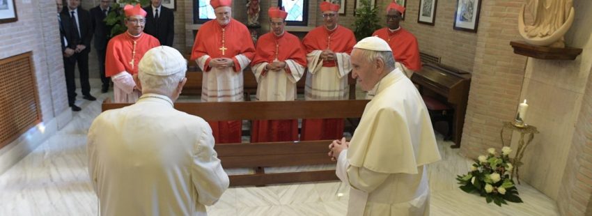 Pero hasta llegar a ese momento, Francisco y sus nuevos “consejeros” pusieron rumbo al monasterio Mater Ecclesiae, la residencia de Benedicto XVI, situada dentro de los muros vaticanos. El Papa emérito les esperaba en la capilla de la casa, acompañado de su secretario, Georg Gänswein.