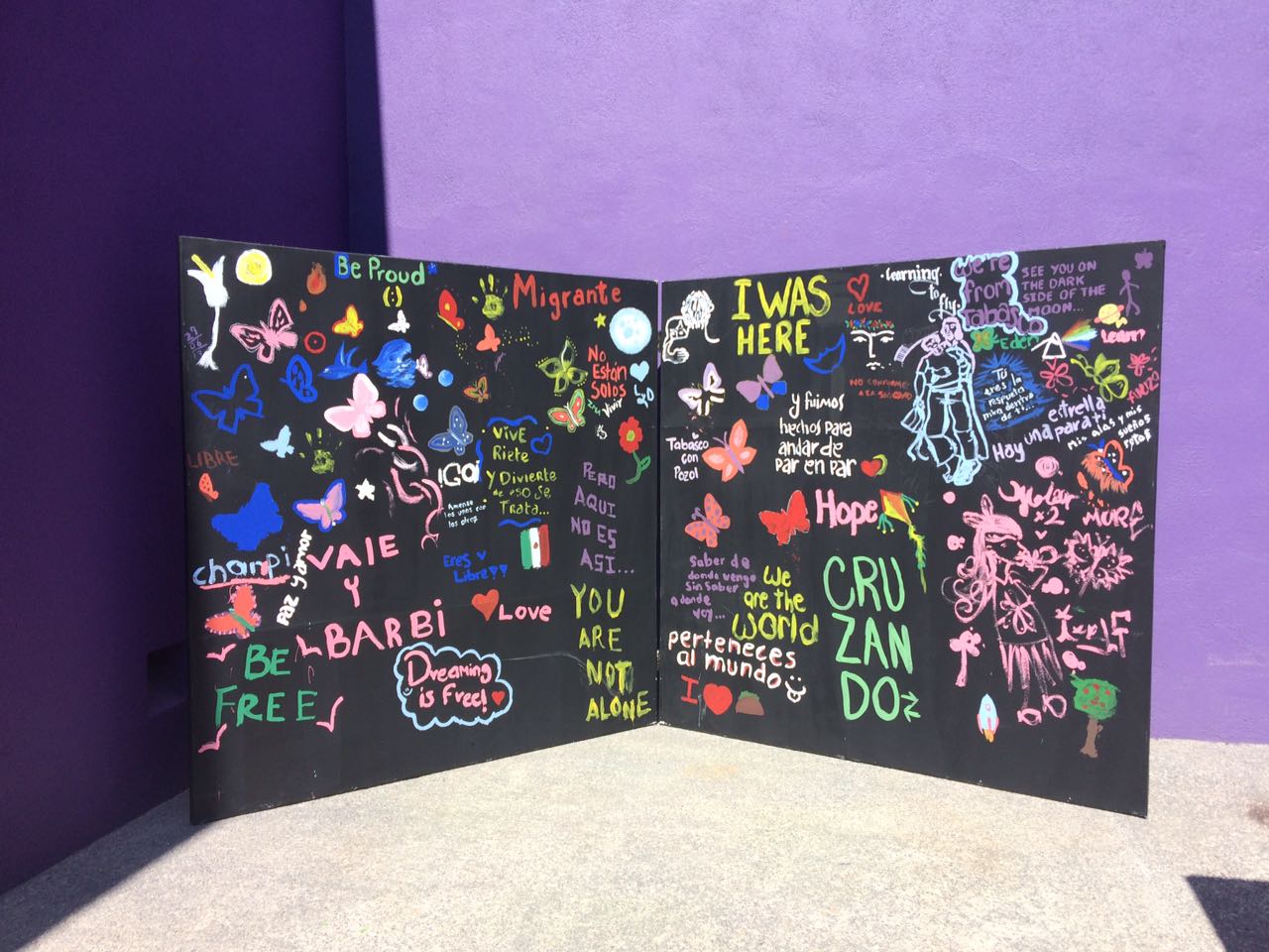 Con mensajes como: “Migrar no es un delito, hacer emigrar sí”, “Todos somos humanos”, “Saber de dónde vengo sin saber a dónde voy”, “Tu camino empieza sin límites”, “Mis alas y mis sueños rotos” o “Cuando encuentres un migrante dale la mano, es tu amigo, no tu enemigo”, un grupo de migrantes expuso sobre un peculiar muro la difícil situación que viven en su intento de alcanzar el llamado “sueño americano”.