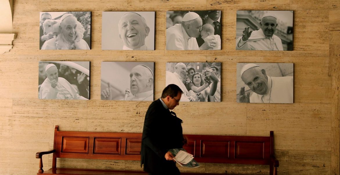 BOG16. BOGOTÁ (COLOMBIA), 03/08/2017.- Un hombre camina frente a un conjunto de fotografías del Papa Francisco en las instalaciones del Palacio Arzobispal luego de una rueda de prensa de integrantes de la Arquidiocesis de Bogotá con motivo de la visita del Sumo Pontífice, hoy, jueves 3 de agosto de 2017, en Bogotá (Colombia). Con jornadas de oración, vigilias y eventos relacionados con la convivencia y la familia Bogotá recibirá la visita del papa Francisco, quien llegará a Colombia el próximo 6 de septiembre, informó el episcopado. Como parte de estas actividades, el 2 de septiembre se entronizará en la Catedral Primada de Bogotá el cuadro de la Virgen de Chiquinquirá, patrona de Colombia. EFE Mauricio Dueñas Castañeda