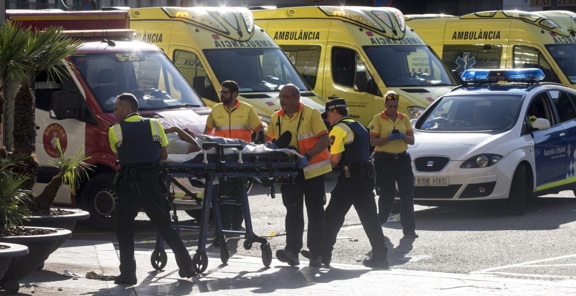 GRA249. BARCELONA, 17/08/2017.- Traslado de uno de los afectados por el atentado ocurrido hoy en las Ramblas de Barcelona, un atropello masivo en el que una furgoneta ha arrollado a varios peatones que paseaban por la zona, y en el que al menos una persona ha fallecido y otras 32 han resultado heridas. EFE/Quique García