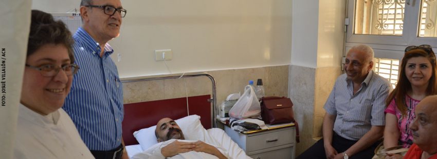 El médico entra en una habitación donde hay cuatro camas. En la primera saluda a Said Deri, un joven musulmán de 17 años que tiene cáncer de testículos. La hermana Anne Marie conversa con él en árabe, nos cuenta que es un buen paciente con el que ha hecho mucha amistad. Junto a Said está Remond Tarrap, un hombre de 50 años que tiene una enfermedad cardíaca y está en muy mal estado; “pero no tiramos la toalla con él, parece que ha mejorado un poco estos días”, afirma el doctor. Por último saludan a otro hombre aún convaleciente, Munir Ocsan, que ha venido su familia a visitarle. “Está aquí recuperándose porque su columna vertebral quedó muy dañada después de uno de los últimos bombardeos”. Munir sonríe al oír hablar al doctor.