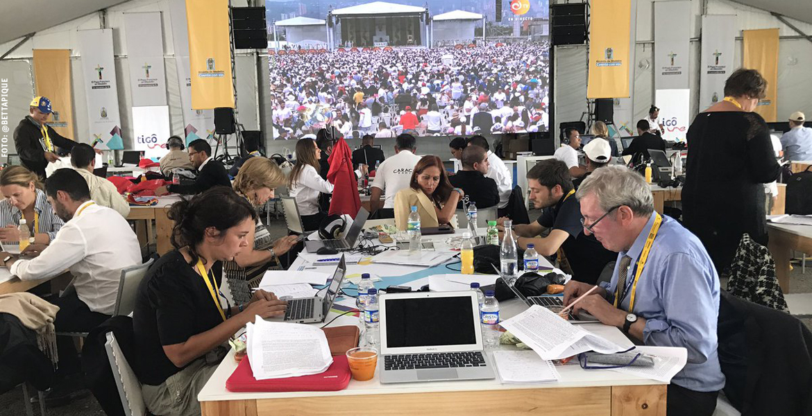 La sala de prensa instalada en el Hotel Tequendama (Bogotá) ha funcionado muy bien: era amplia y ha acogido presencias importantes, como las del presidente Juan Manuel Santos y la del ministro de Defensa, Luis Carlos Villegas Echeverri. Algunos colegas han considerado algo escasa la presencia ante los medios de los obispos y del portavoz vaticano Greg Burke.