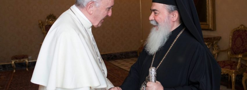 “Defender y preservar”. Son los dos verbos utilizados por Francisco durante el encuentro privado que mantuvo esta mañana con el patriarca greco ortodoxo Teófilo III. El Papa aprovechó la cita para renovar su cercanía “a todos aquellos que sufren los conflictos que azotan desde hace décadas a Tierra Santa”.