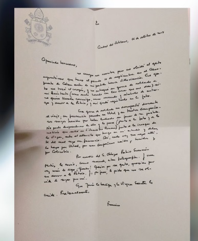 En su mensaje, Francisco le cuenta al exmilitar que conservó la gorra que éste le entregó en CATAM, y que al llegar a Roma la puso junto a una imagen de la Virgen, sobre un altar que tiene en su estudio personal de Santa Marta. “Cada vez que rezo allí, lo hago por usted, por sus compañeros caídos y heridos, y por Colombia”, afirma el Papa, antes de añadir: “Gracias por su gesto, gracias por su amor a la Patria; y, por favor, le pido que no se olvide de rezar por mí”.