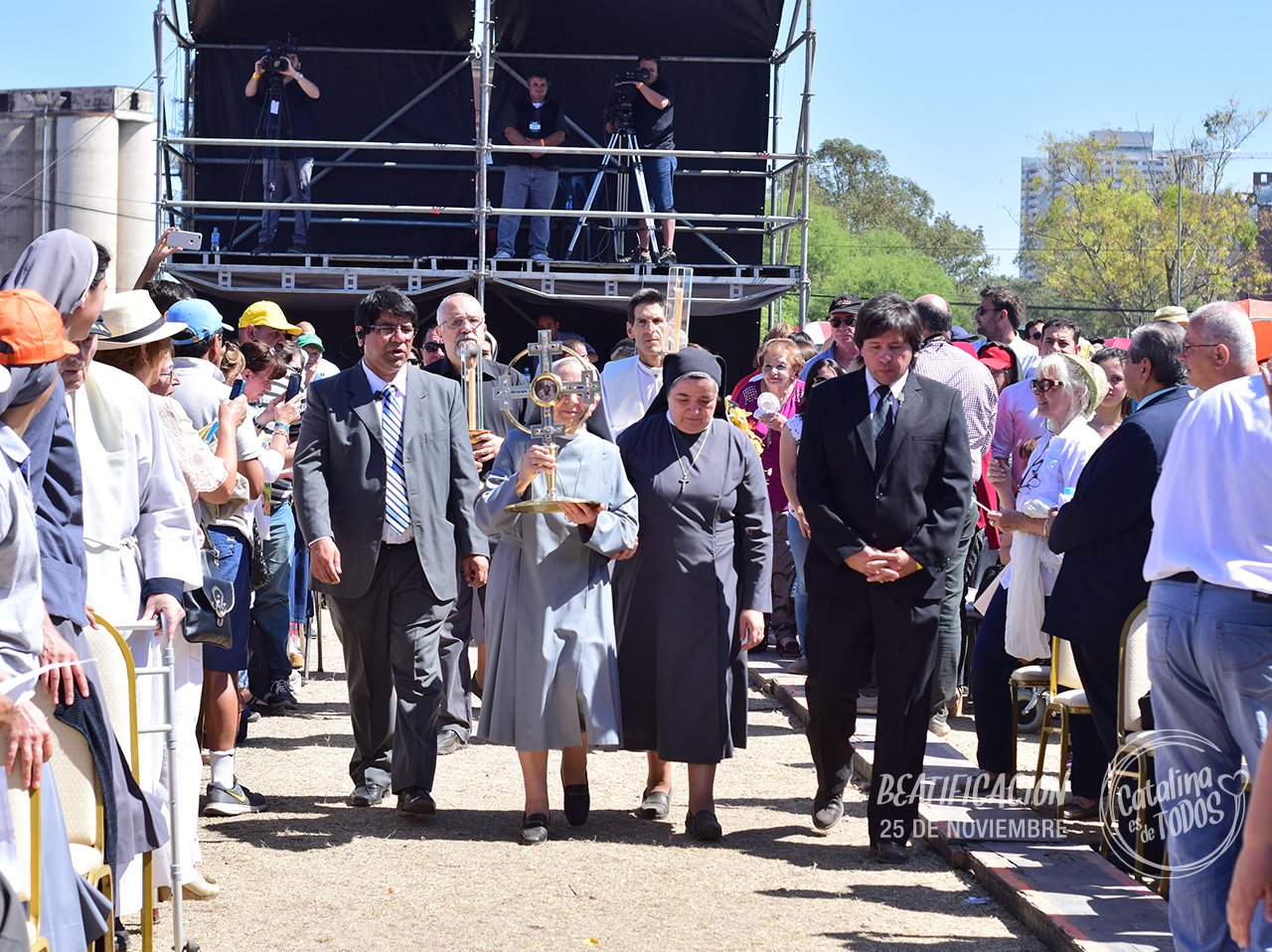 A las 10.28 una gigantografía con la imagen de la nueva beata argentina fue desplegada al costado del altar y, en medio de vítores y aplausos de la multitud presente, se acercaron al altar las reliquias de la Madre Catalina. El relicario se confeccionó con una forma semejante a una custodia porque la beata Madre Catalina era Cristocéntrica, amante de la Eucaristía, y fue llevado por la hermana María Silvia Fiorentino ECJ, madre general de las Esclavas del Corazón de Jesús; la hermana Marita Barrionuevo ECJ y Emma Paulinelli, vicepostuladoras de la causa de beatificación; el hermano José Molina SJ, médico perito del milagro; Eugenia Valdéz, hija de Sofía Acosta, que recibió el milagro de la Madre Catalina y el presbítero Santos Moyano, sobrino tataranieto de la nueva beata.