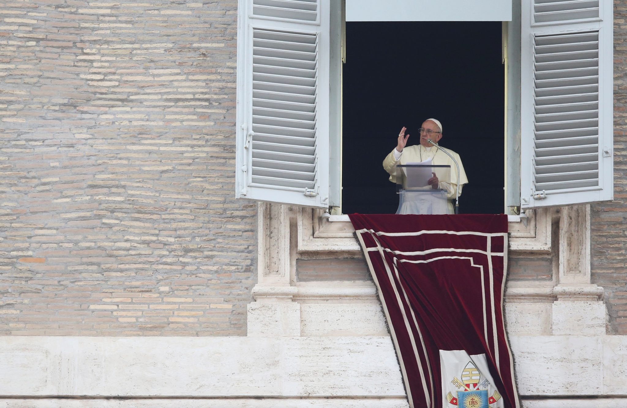 Pope Francis leads the Angelus from the window of his studio overlooking St. Peter's Square Oct. 22 at the Vatican. (CNS photo/Tony Gentile, Reuters) See POPE-ANGELUS-MISSION-2019 Oct. 23, 2017.