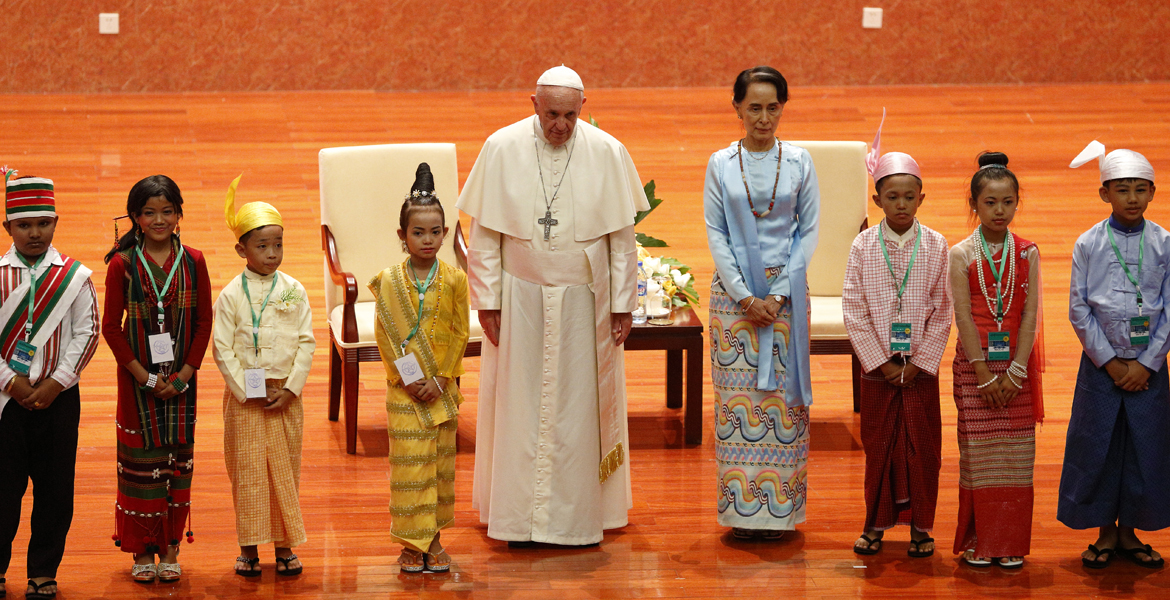 Tras la charla, la líder birmana acompañó a Francisco al Centro de Convenciones Internacionales, donde Francisco ha pronunciado su primer discurso en el país, a las autoridades, miembros de la sociedad civil y cuerpo diplomático de Myanmar.