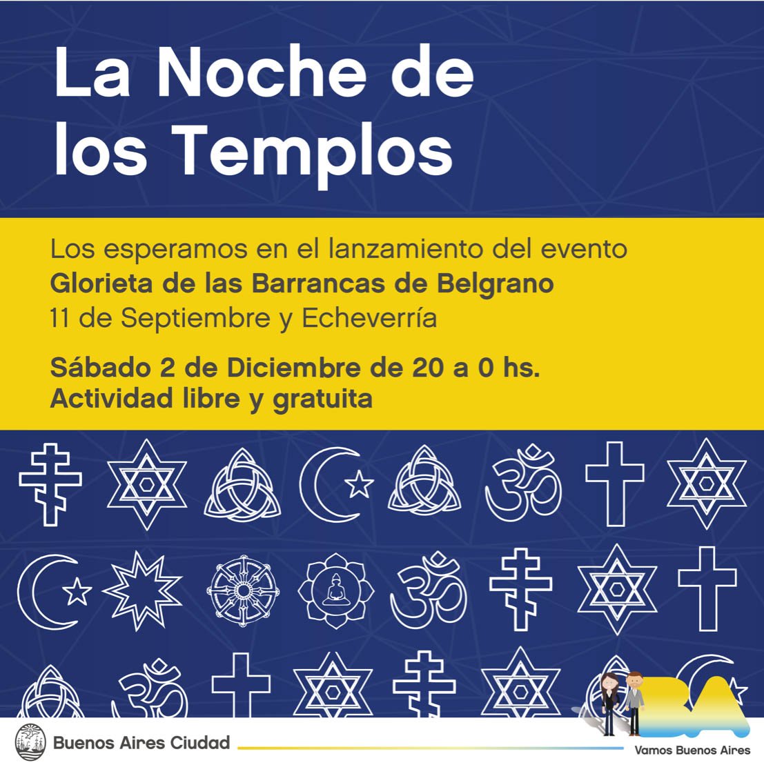 Dentro del programa “Las noches de Buenos Aires” que organiza el gobierno de la ciudad autónoma, se desarrollará este sábado 2 de diciembre y a partir de las 20 y hasta las 0, la “Noche de los Templos”. La inauguración estará centrada en la Plaza Barrancas de Belgrano, con la presencia de todos los cultos.