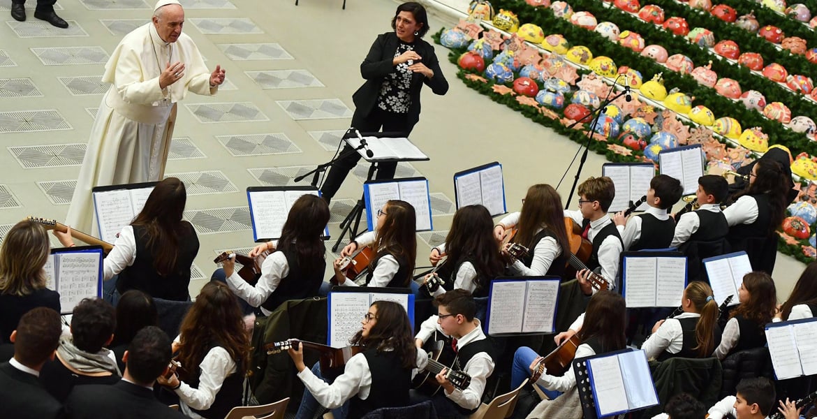 Al finalizar la audiencia, que ha tenido lugar en el Aula Pablo VI, entre otros encuentros Francisco ha saludado a una orquesta infantil que ha participado en el acto.