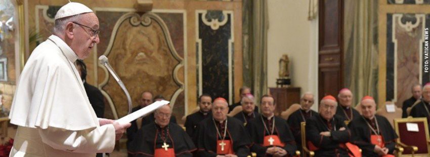 El Pontífice ha centrado su discurso en “la relación de la Curia con las naciones, con las Iglesias particulares” y las demás religiones, “es decir, con el mundo exterior”, en el “contexto de la reforma” impulsada por Bergoglio, algo que describió con la frase de Xavier de Mérode, prelado que sirvió a Pío IX: “Hacer la reforma en Roma es como limpiar la Esfinge de Egipto con un cepillo de dientes”.