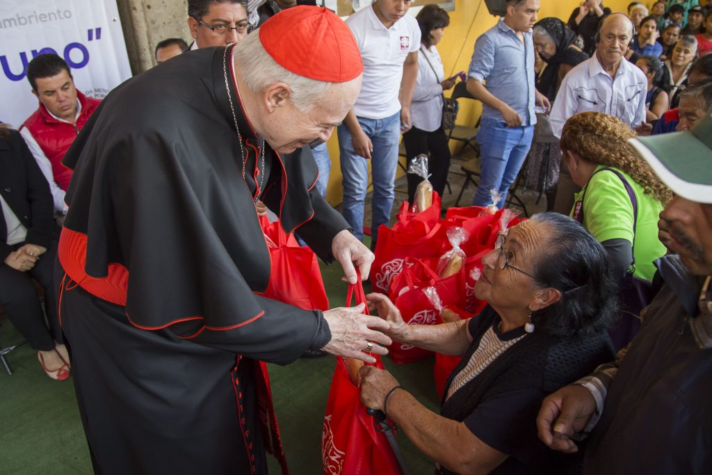 Tras concluir la misa dominical en la Catedral de Corpus Christi, el cardenal Carlos Aguiar Retes, en compañía de algunas autoridades civiles, hizo entrega de 300 cenas navideñas a personas necesitadas de la Arquidiócesis de Tlalnepantla.