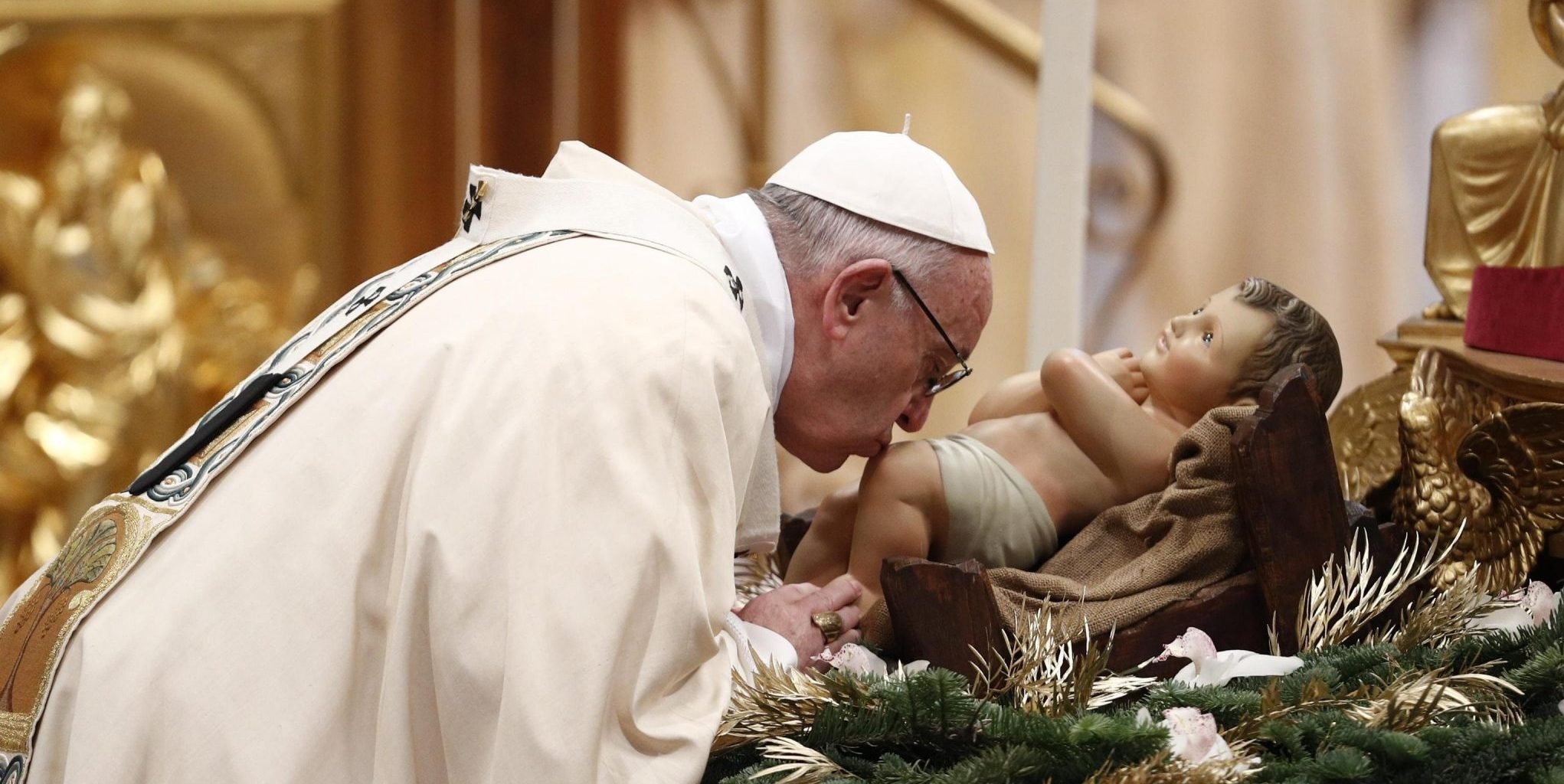 Vatican City (Vatican City State (holy See)), 06/01/2018.- Pope Francis kisses a baby Jesus statue as he arrives to lead the Epiphany mass in the Saint Peters Basilica in the Vatican City, 06 January 2018. (Papa) EFE/EPA/GIUSEPPE LAMI