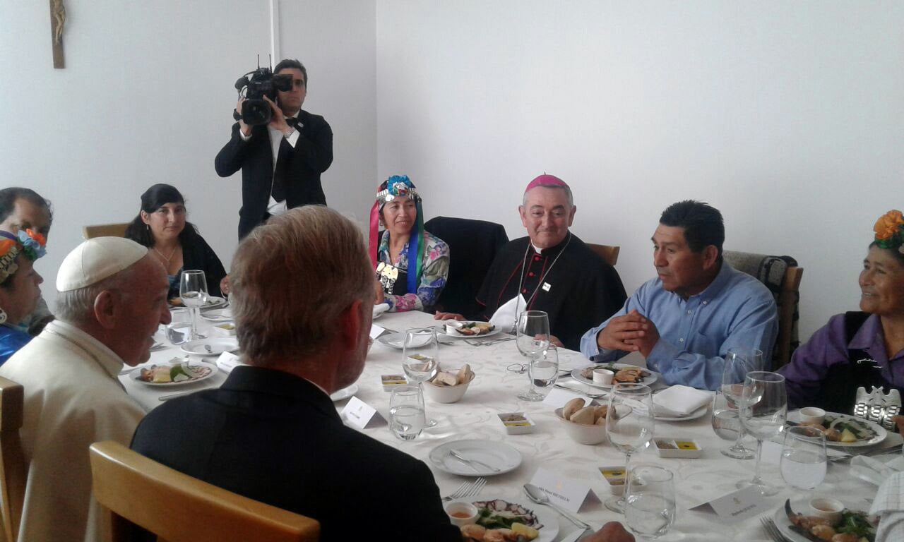 Tras la Misa en el aeródromo de Maqueue ante 200.000 peregrinos, el papa Francisco se ha dirigido a la casa Madre de la Santa Cruz –a pocos kilómetros del aeródromo–, convento habitado por las hermanas de la Santa Cruz, con gran presencia en el continente. Allí ha almorzado con otras 11 personas originarias de la zona, 8 de ellos mapuches. Entre ellos se encontraba un representante de la comunidad mapuche de Boyeco, una artesana tejedora, un buzo mariscador, otras dos mujeres mapuches y un agricultor, propietario de unas tierras dadas por el Estado al pueblo mapuche como compensación, según informa la Agencia EFE.