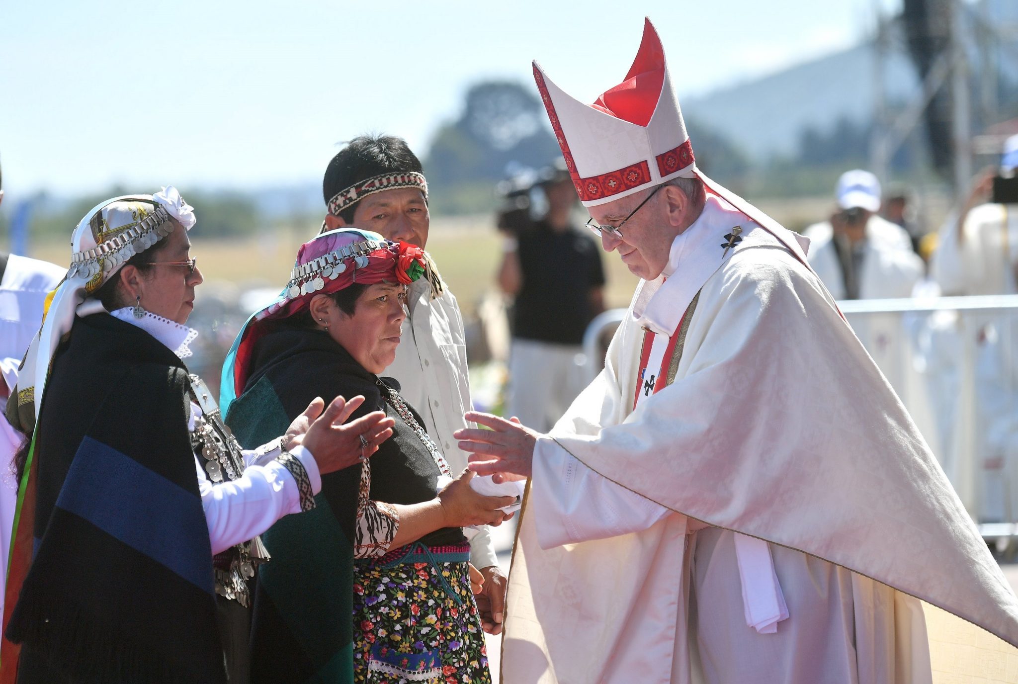 El Papa ha elogiado la belleza de la región tras saludar a los distintos pueblos que han acudido (mapuches, rapanui, aymara, quechua y atacameños). Sin embargo, tras alabar “sus majestuosos volcanes nevados, sus lagos y ríos llenos de vida, un paisaje que nos eleva a Dios y es fácil ver su mano en cada criatura”, ha lamentado otro aspecto de la tierra: “Si nos acercamos a su suelo, lo escucharemos cantar, y con tristeza ‘Arauco tiene una pena que no la puedo callar, son injusticias de siglos que todos ven aplicar‘”, como cantaba Violeta Parra.