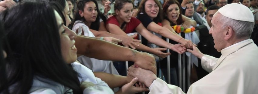 En el gimnasio del Centro Penitenciario Femenino de Santiago se encontró el Papa Francisco con más de 400 mujeres que cumplen allí condena. Del techo del lugar colgaban cientos de cintas de distintos colores creando un hermoso ambiente festivo. Esas cintas, sin embargo, tenían una frase dicha alguna vez por el Papa y seleccionada por cada reclusa para esta ocasión.