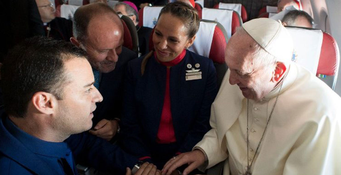 Como han contado en Twitter tres de los periodistas acreditados en el avión papal, Eva Fernández (Cope), Álvaro de Juana (Aciprensa) y Elisabetta Piqué (La Nación), todo surgió fruto de la casualidad. En un momento dado, cuando la tripulación se iba a hacer una foto con Bergoglio, este conversó con la pareja, que le contó que lleva ocho años casada por lo civil y le pidió una bendición de sus anillos. Cuando el Pontífice les preguntó si les gustaría casarse por la Iglesia, al ser su respuesta positiva, este se ofreció a presidir la ceremonia. Ahí mismo, a bordo del avión.