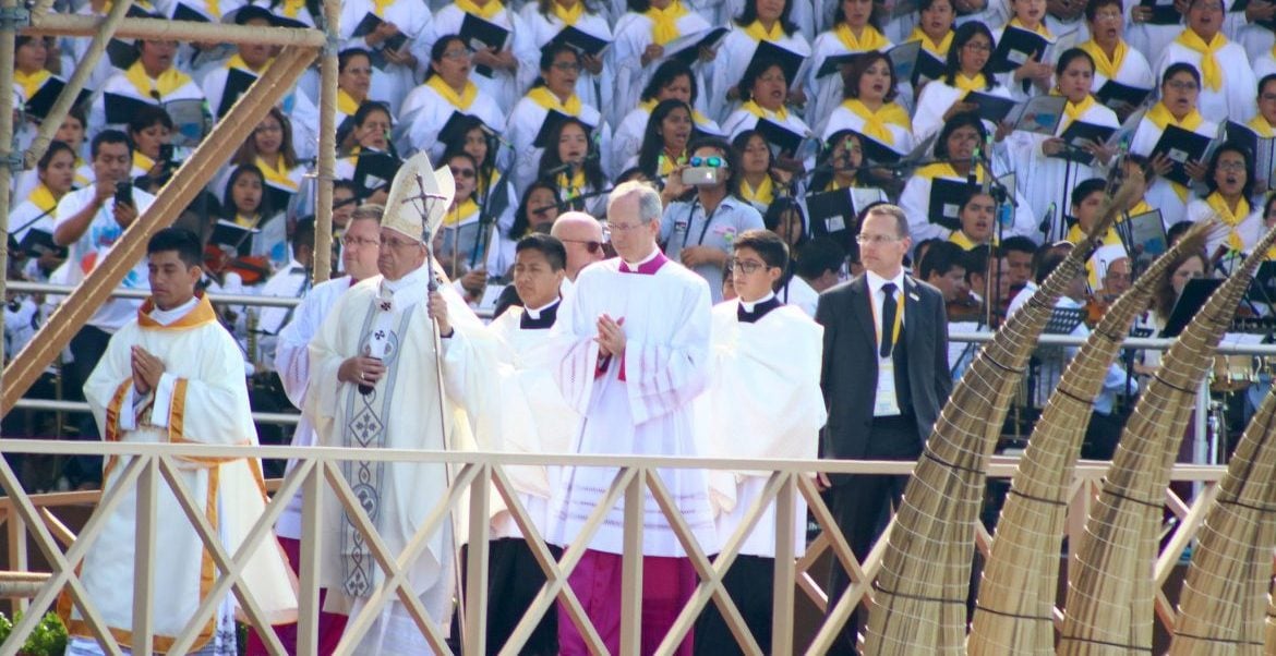 La inculturación y el mestizaje visto en la jornada anterior se tradujo en solemnidad en esta eucaristía en la que estuvieron presentes las principales las principales imágenes de Cristo, la Virgen y de los santos con las que se identifican las comunidades de la zona. Precisamente el Papa tuvo un guiño al final de la homilía al invocar a la Virgencita de la Puerta a través de los versos de una canción marinera. “¿Se animan a cantarla? La cantamos juntos. ¿Quién empieza?”, expresó el Papa. Ante la falta de arranque del coro, llamó a los asistentes a recitarla juntos.
