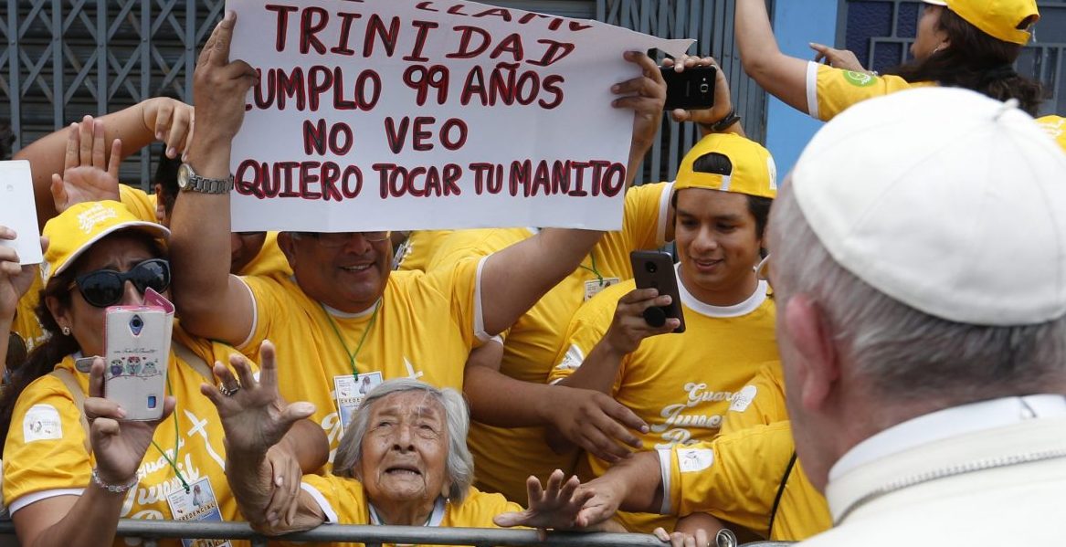 Francisco ordenó detener el Papamóvil en las calles de Trujillo para felicitar por su cumpleaños a Trinidad, una anciana invidente de 99 años