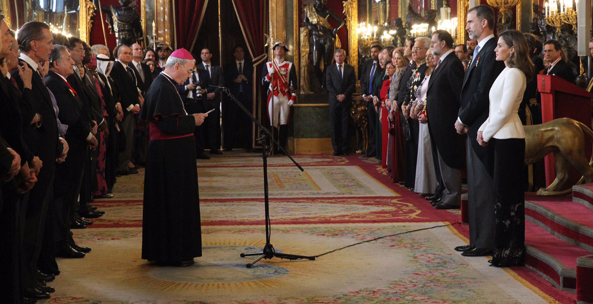 “Hacemos sentidos votos por los deseos y empeños manifestados por vuestra majestad al señalar que España es una realidad a la que no se puede y no se debe renunciar“, señaló el nuncio, como decano del cuerpo diplomático, además de mostrar su satisfacción por “la comprobación del fortalecimiento de las instituciones” en España, a la que ha definido como “una gran nación caracterizada por un voluntad de concordia”.