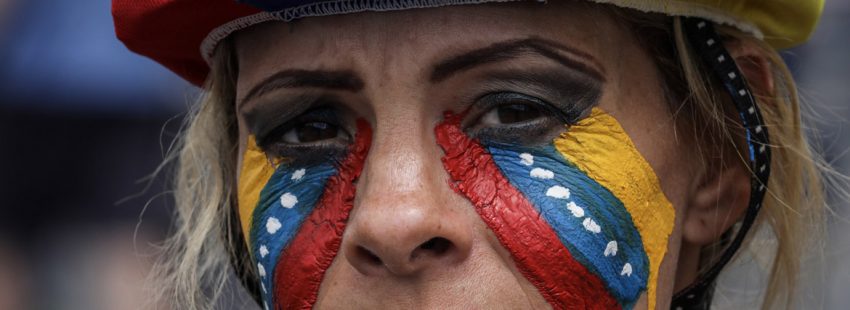 mujer maquillada bandera de Venezuela con lágrimas durante una protesta contra Gobierno de