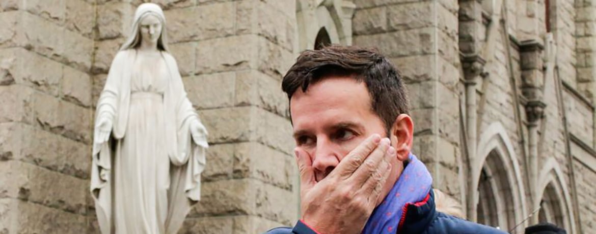 Chilean victim of clerical sexual abuse Juan Cruz reacts on the street after meeting with investigator, Archbishop Charles Scicluna of Malta in New York City, New York, U.S., February 17, 2018. REUTERS/Eduardo Munoz