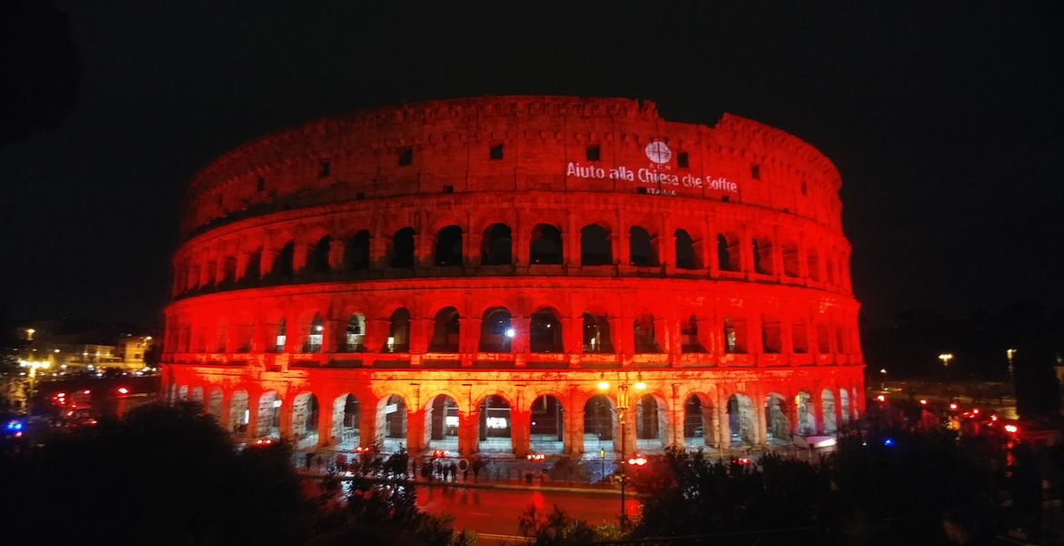 El secretario de estado del Vaticano Pietro Parolin participó en la iniciativa de Ayuda a la Iglesia Necesitada, que iluminó de color rojo el Coliseo romano, a la vez que iglesias en Mosul y Alepo, para recordar la persecución que sufren los cristianos en Irak o Siria.