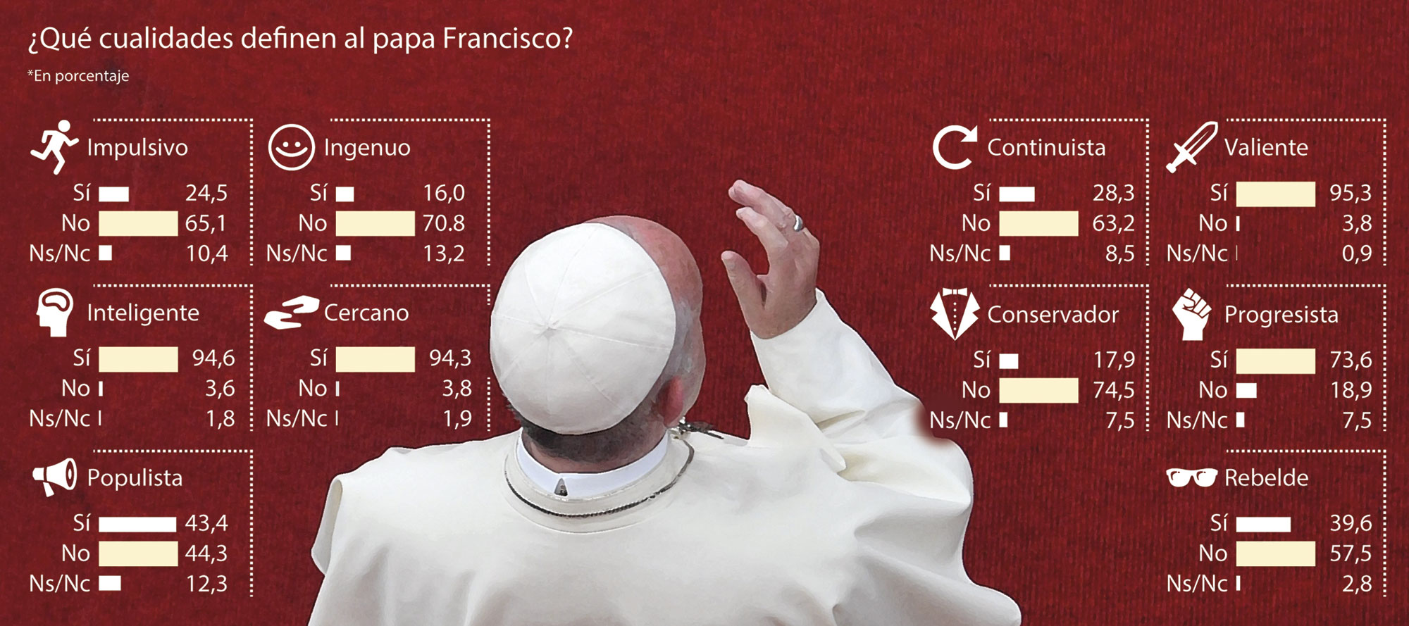 Las cuatro cualidades que destacan los españoles son valiente (95,3%), inteligente (94,6%), cercano (94,3%) y progresista (73,6%). En estas cualidades hay un altísimo consenso tanto por edades como por identificación religiosa, presentando diferencias por debajo de 10 puntos, con la única excepción de progresista, cualidad para la que se detecta el mayor salto entre los jóvenes de 18 a 29 (57%) y el siguiente escalón de edad, de 30 a 44 (73%). También hay diferencias en cuanto a cercano, siendo percibido así más por los adultos de 45 a 64 (100%) que por los más jóvenes, de 18 a 29 (71,4%). Algo similar sucede al comparar entre católicos y ateos, obteniendo porcentajes parecidos en los casos de progresista (73-78%) y algo superiores en los de valiente (96-76%), cercano (95-78%) e inteligente (95-80%).