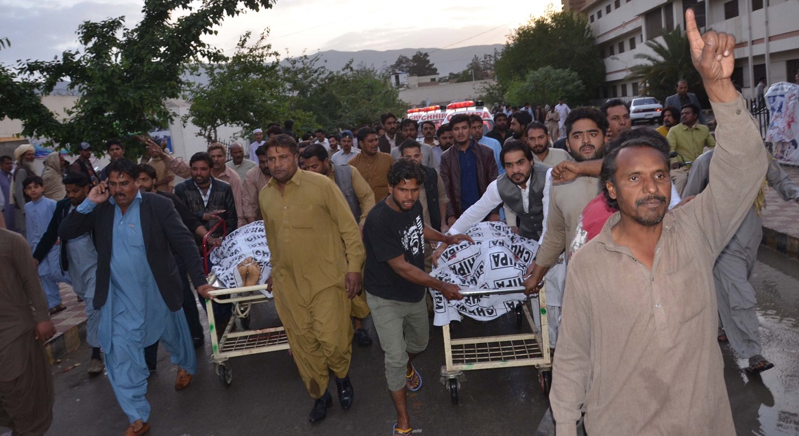 QTA01. Quetta (Pakistan), 15/04/2018.- People shout slogans after two members of Christian community were killed by unknown gunmen in restive Quetta, Pakistan, 16 April 2018. At least two people of the Christian community were killed and three injured when unknown gunmen opened fire on them in Quetta. Quetta, the capital of Baluchistan province, is one of the most conflict-ridden areas of Pakistan, with the presence of armed separatist groups, Taliban factions and other rebel groups. (Incendio) EFE/EPA/JAMAL TARAQAI