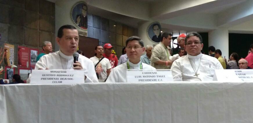 Así lo manifestaron en un comunicado firmado por los obispos presidentes de ambas instituciones, Gustavo Rodríguez Vega, del DEJUSOL-CELAM, y José Luis Aguaje, del SELACC (en la foto, junto con el cardenal Tagle), en el que expresan su solidaridad con “una población ya crucificada por años por una guerra interna con crueldades indecibles, turbios intereses e injusticias”.