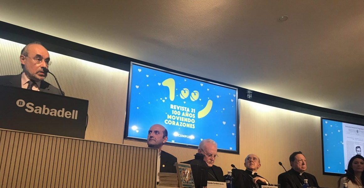 Bajo el lema ‘100 años moviendo corazones’, el auditorio madrileño del Banco Sabadell acogió la celebración del centenario de la revista 21, editada por la Congregación de los Sagrados Corazones, un acto que estuvo presidido por el cardenal arzobispo de Madrid, Carlos Osoro, y en el que se entregó el III Premio Damián de Molokai a Julián del Olmo, director del programa Pueblo de Dios (TVE).