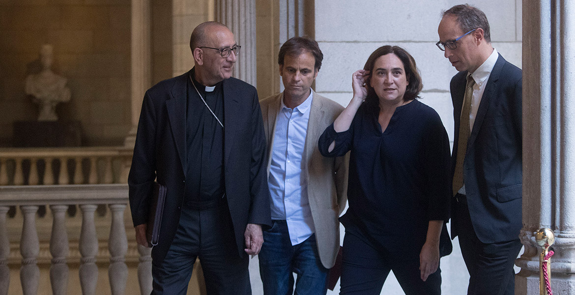 BARCELONA, 10/07/2018. La alcaldesa de Barcelona,Ada Colau (2d), junto al cardenal Juan José Omella (i); el doctor Francesc Torralba, patrón de la Fundación Joan Maragall (d) y Jaume Asens, teniente de alcalde de derecho a la ciudadanía, cultura y deportes (2i) participan en un acto de la Fundación Joan Maragall para hablar de inmigración, con motivo de La publicación de la revista "Qüestions de Vida Cristiana", que defiende el deber de acoger como una exigencia ética EFE/Marta Pérez