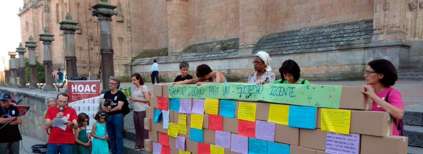 Ayer por la tarde, tras la celebración de la eucaristía, la HOAC hizo un gesto público la plaza de Anaya de Salamanca, en el que levantaron ‘El muro de la injusticia’. “Los militantes obreros cristianos queremos transformar, porque nuestra fe nos llama a exigir que el trabajo sea digno para que la sociedad sea decente”, dijeron los organizadores cuando derribaron el simbólico muro.
