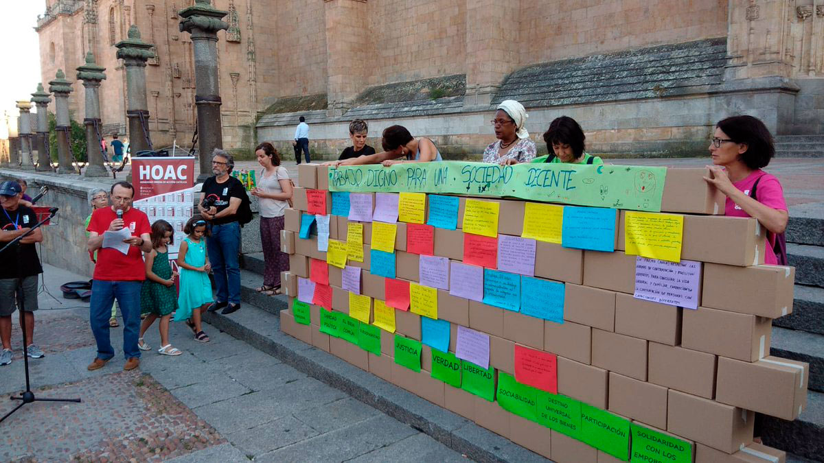 Ayer por la tarde, tras la celebración de la eucaristía, la HOAC hizo un gesto público la plaza de Anaya de Salamanca, en el que levantaron ‘El muro de la injusticia’. “Los militantes obreros cristianos queremos transformar, porque nuestra fe nos llama a exigir que el trabajo sea digno para que la sociedad sea decente”, dijeron los organizadores cuando derribaron el simbólico muro.