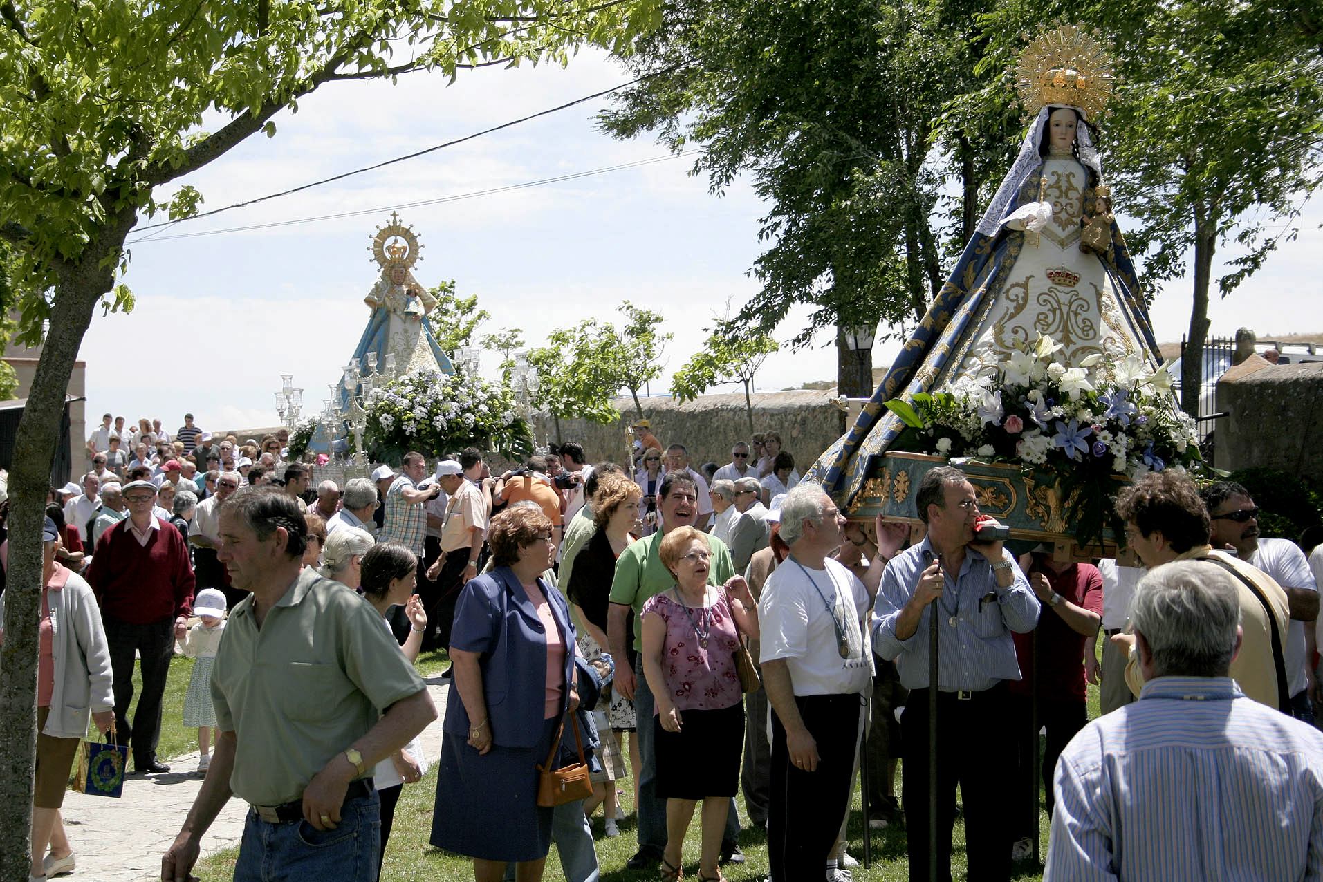 AV01. AVILA, 24/06/07.- La Cofradía de Nuestra Señora del Socorro, de Ávila, celebró hoy el vigésimo aniversario de su última subida al santuario de Nuestra Señora de Sonsoles, en la carretera N-403, con una peregrinación hasta este recinto religioso y la posterior procesión con las imágenes de las dos advocaciones de la Virgen. En la imagen, cientos de devotos de la Virgen del Socorro (d), y la Virgen de Sonsoles (fondo), salen en procesión, por el recinto de la iglesia de Sonsoles. EFE/JOSE RAMON SAN SEBASTIAN