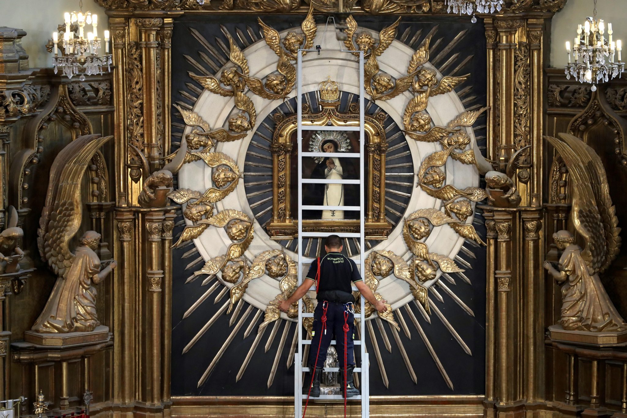 GRAF6165. MADRID, 15/08/2018.- Momento del descenso del cuadro de la Virgen de la Paloma, patrona del Cuerpo de Bomberos de Madrid, a cargo del piquete de gala de este cuerpo de emergencias que, como cada año se lleva a cabo en la iglesia madrileña del mismo nombre en la festividad del 15 de agosto. EFE/J.J. Guillén