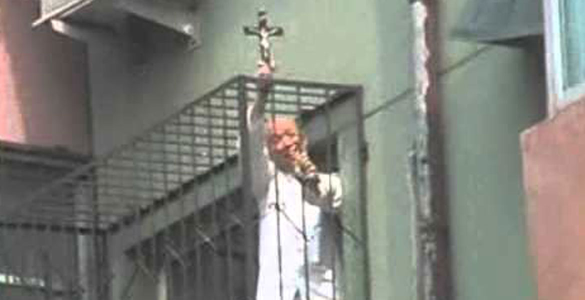 Cuarto piso de una prisión china. John Han Dingxiang (1939-2007) se asoma con el crucifijo en la mano. El obispo de la diócesis de Yongnian (Hebei, China) permaneció décadas en prisión en diferentes etapas de su vida, desde su primer arresto, a los 33 años, hasta que murió de cáncer a los 68. Las autoridades no permitieron que fuera acompañado en su lecho de muerte.