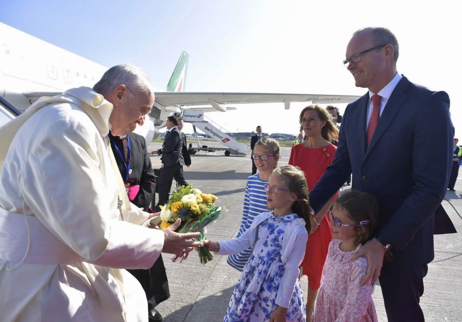 VAT101. Dublin (Ireland), 25/08/2018.- A handout photo released by the Vatican Press Office shows Pope Francis (L) receiving a bouquet of flowers from a daughter of Ireland's Foreign Minister Simon Coveney (R) upon his arrival at Dublin airport, in Dublin, Ireland, 25 August 2018. The Pontiff is on a two-day visit to Ireland. Others are not identified. (Papa, Irlanda) EFE/EPA/VATICAN PRESS OFFICE/HANDOUT HANDOUT EDITORIAL USE ONLY/NO SALES