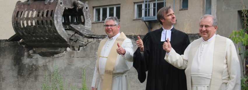 Dicha imagen la protagonizan dos religiosos agustinos de la parroquia de San Pedro, Clemente Dölken y Michael Stern, y, en medio de ellos, el pastor Thoralf Thiele, principal representante de la comunidad protestante local. Los tres, con gesto alegre, levantan su pulgar al cielo. Tras ellos, una excavadora ha iniciado su tarea y está derribando un pequeño tabique de dos metros de altura. Precisamente, el muro que, desde hace muchos años, ha separado (físicamente) a ambas realidades cristianas.