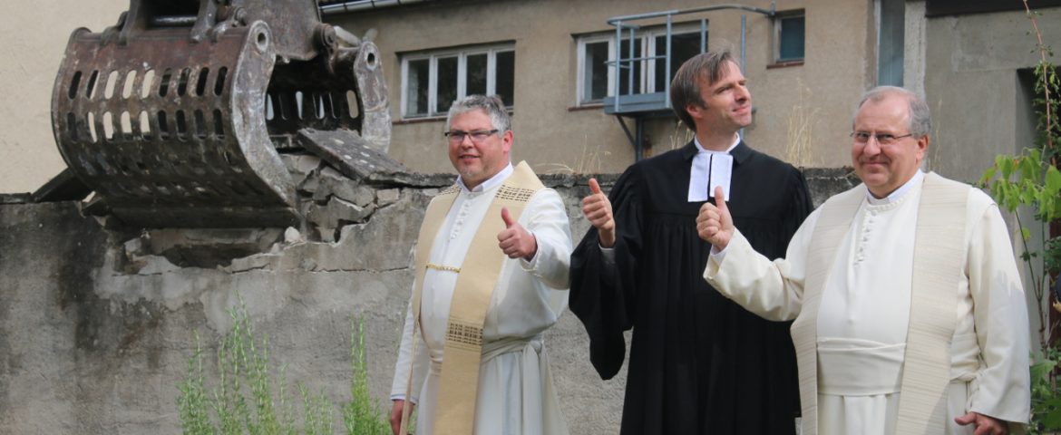 Dicha imagen la protagonizan dos religiosos agustinos de la parroquia de San Pedro, Clemente Dölken y Michael Stern, y, en medio de ellos, el pastor Thoralf Thiele, principal representante de la comunidad protestante local. Los tres, con gesto alegre, levantan su pulgar al cielo. Tras ellos, una excavadora ha iniciado su tarea y está derribando un pequeño tabique de dos metros de altura. Precisamente, el muro que, desde hace muchos años, ha separado (físicamente) a ambas realidades cristianas.