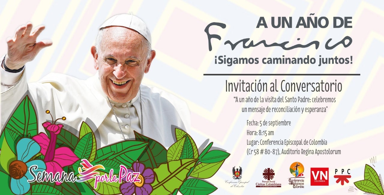 Con el propósito de invitar a la sociedad civil a continuar avanzando en la consolidación de la paz como bien común, a partir del mensaje de reconciliación y de esperanza del papa Francisco durante su visita a Colombia –entre el 6 y el 10 de septiembre de 2017–, la Conferencia Episcopal de Colombia (CEC), Pastoral Social / Cáritas colombiana, la Conferencia de Religiosos de Colombia (CRC), el canal Cristovisión y VidaNueva realizarán el conversatorio ‘A un año de la visita de Francisco, ¡sigamos caminando juntos!’.